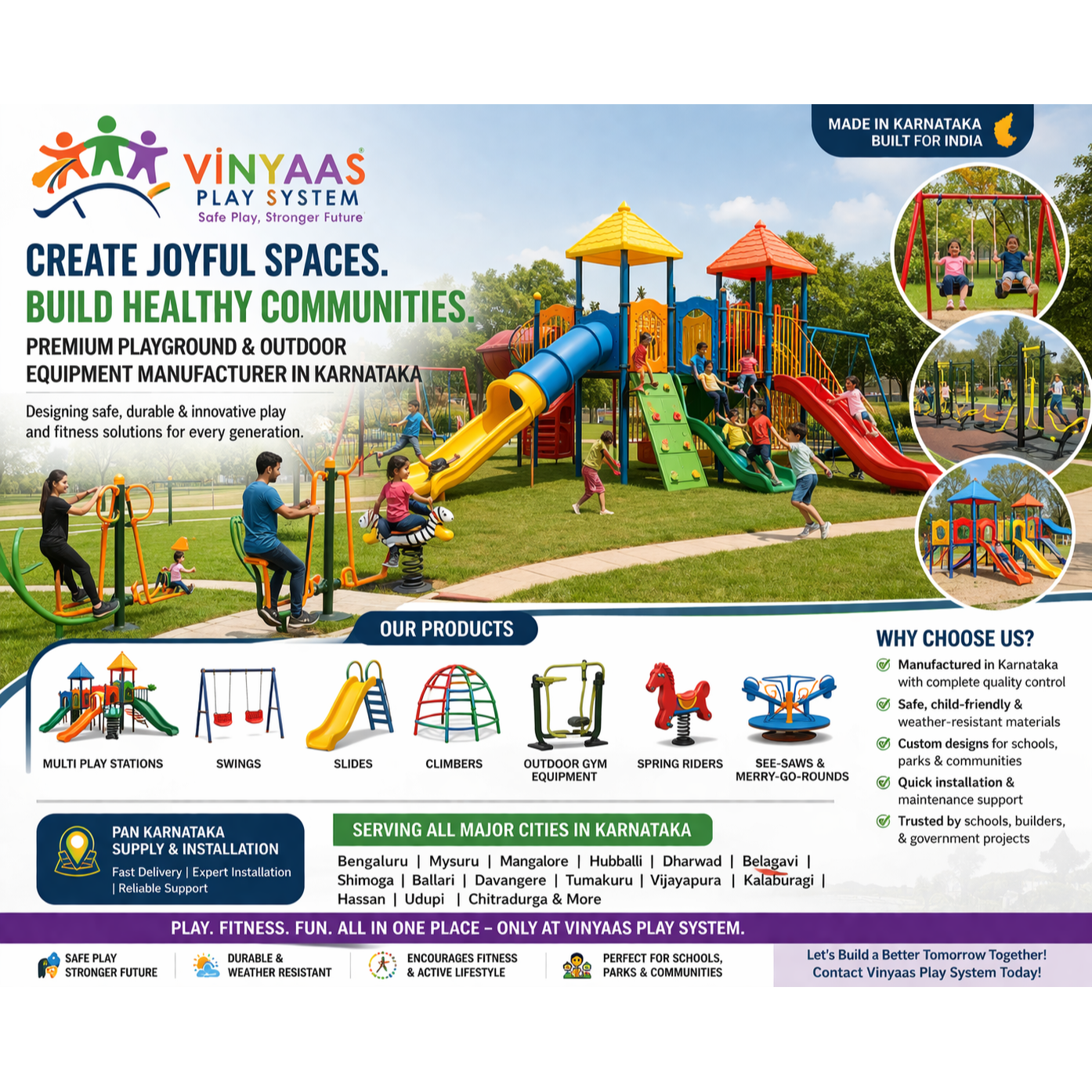 Vinyaas Play System is one of Karnataka’s leading manufacturers of playground equipment, outdoor fitness equipment, garden play structures, and children’s activity toys. With a strong presence across major Karnataka cities such as Bengaluru, Mysuru, Hubballi, Dharwad, Mangaluru, Belagavi, Shivamogga, Ballari, Davangere, and Tumakuru, we specialize in designing safe, durable, and innovative outdoor play solutions for schools, residential communities, parks, public spaces, resorts, and urban gardens.